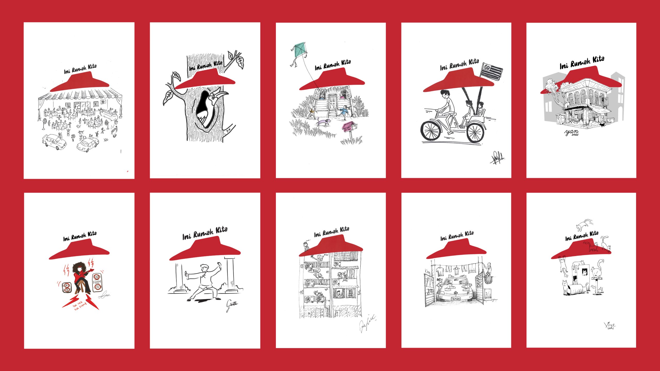 Ini Rumah Kita unites 68 artists from across Malaysia – from established names to emerging students – to illustrate their own interpretation of ‘rumah’ (home) under the iconic Pizza Hut red roof. Each artwork tells a different story: shades of childhood, colours of culture, and fragments of memory. Yet under the one red roof, these differences are connected by a common thread —shared homes, shared flavours, and shared identity as Malaysians.